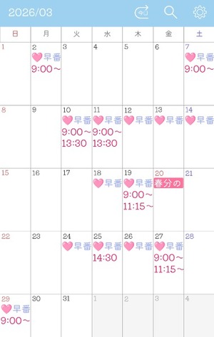 3月の予定です。早番と記載のところはスタートから空いております☆