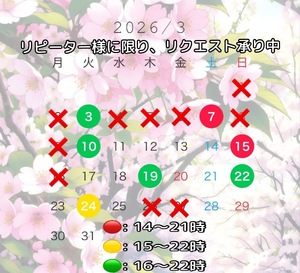 スケジュールはこちら ?https://freecalend.com/open/mem266181_date202603気になる日をタップしていただくと、詳細がポップアップいたします