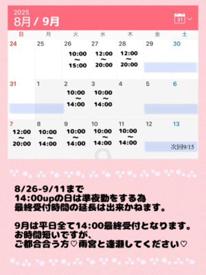 明日〜9/11までのシフトを