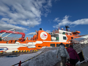 この日のために防寒グッズと滑りにくい靴を準備しましたが、船の上はとーっても寒かったし、地面がツルツルで大変でした![]()