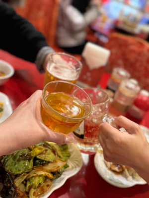帰りに、南京町で中華を食べながら祝杯しました?