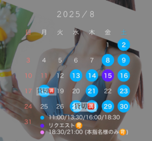 本指名様限定でこれ以外のリクエスト出勤日を設けておりますので、お問い合わせくださいませ。