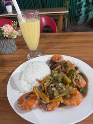 そして頼んでたマンゴースムージーとガーリックシュリンプが来たけど、スムージーにもシュリンプにもハエが突っ込んでくる…。