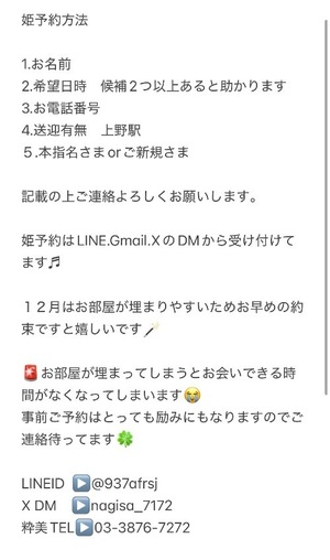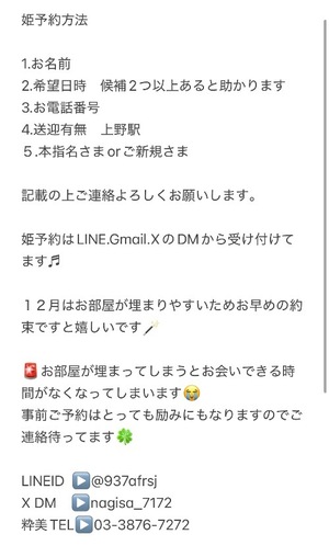 姫予約方法は、 LINE.Gmail.XのDMから可能です♡