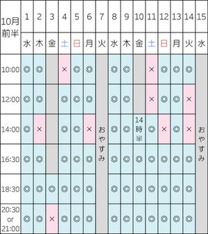 10:00/12:00/14:00/16:30/18:30/20:30or21:00・送迎の有無